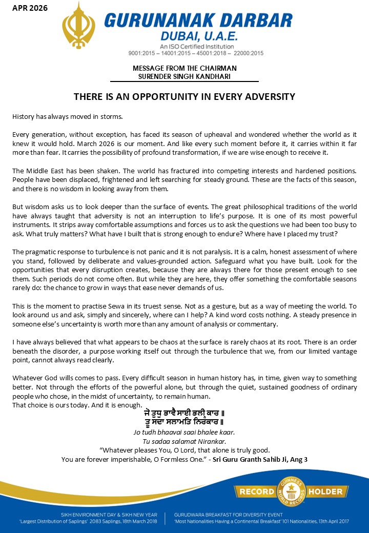 As a precautionary measure, please be informed that the timings of Gurudwara Guru Nanak Darbar Dubai have been temporarily revised.